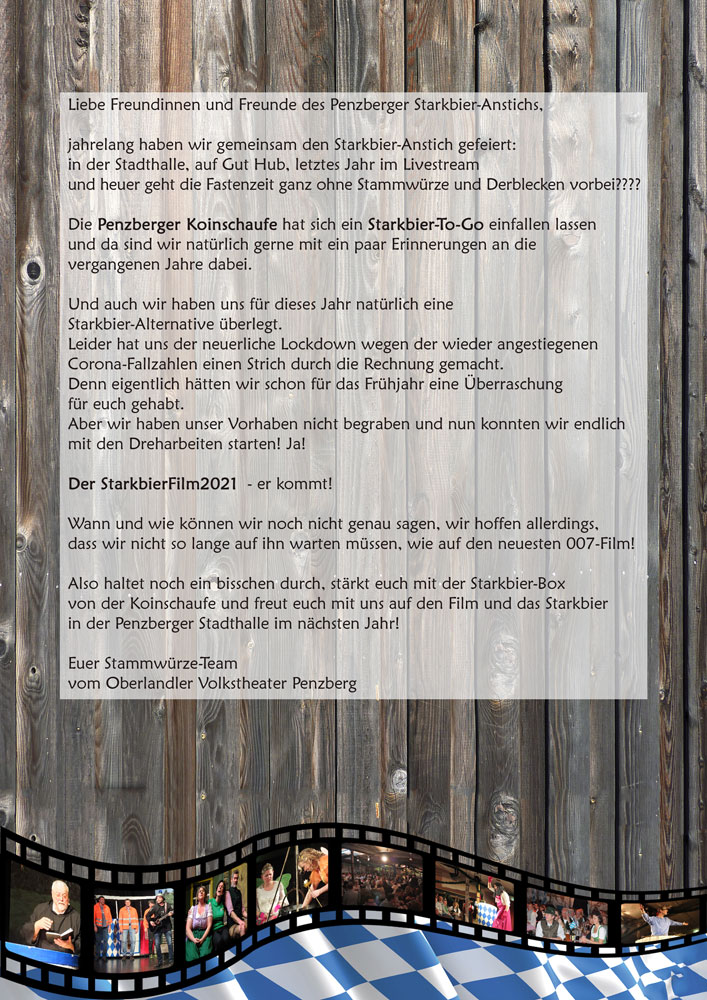 Noch können wir uns vorstellen, dass eine Starkbier-Videofassung-2021 entsteht; sei es ein Maibock, oder Oktoberfest-Bock. Die Hoffnung stirbt zuletzt.