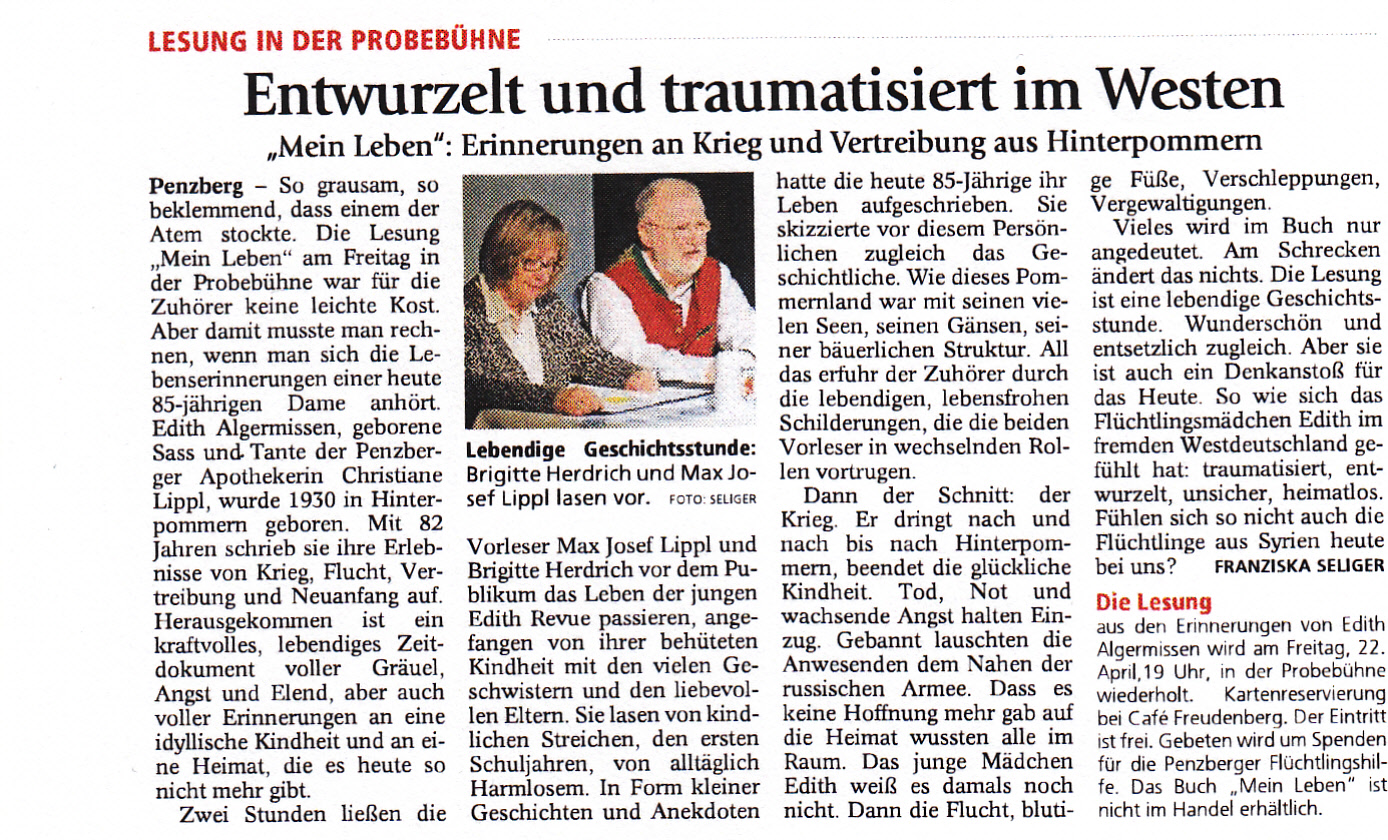 Eine außergewöhnliche Lebensgeschichte, die Max Josef Lippl da aufgetan hatte und doch so nah. Einerseits, weil es sich bei der Autorin um die Tante seiner Frau handelte, andererseits weil Edith Algermissen zu einer nicht geringen Zahl Deutscher gehört, die aus den ehemaligen Ostgebieten am Ende des 2. Weltkriegs vertrieben wurden.