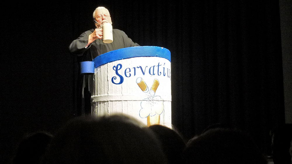 Nachdem die Musik den hungrigen Besuchern das Essen versüßte und das Starkbierfassl von Wiggal Schmuck (bzw. Johannes Bauer) erfolgreich angezapft worden war, stieg Bruder Servatius in die Bier-Kanzel. Dabei kümmerte er sich recht hinterkünftig, aber eher nachsichtig vor allem um Bürgermeisterin und Stadtrat. „Bevor mia uns aufregn, is’s uns liaba wurscht“ war sein Kommentar, wenn seine Ungläubigkeit zu groß wurde. Der Clou der Rede war, dass der Fastenprediger Barnabas aus Geretsried zu Besuch kam, um einige Absonderlichkeiten in ein anderes Licht zu rücken. Er schlug einerseits vor, die Städte Geretsried und Penzberg zu vereinen (und hatte auch gleich einen Wappenvorschlag mitgebracht), andererseits wollte er die Bürgermeisterin (die ja dann überflüssig werde) an Wolfratshausen vermitteln. Dort sind ja bekanntermaßen die Verhältnisse in der Stadtpolitik auch etwas sonderbar.