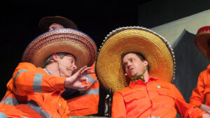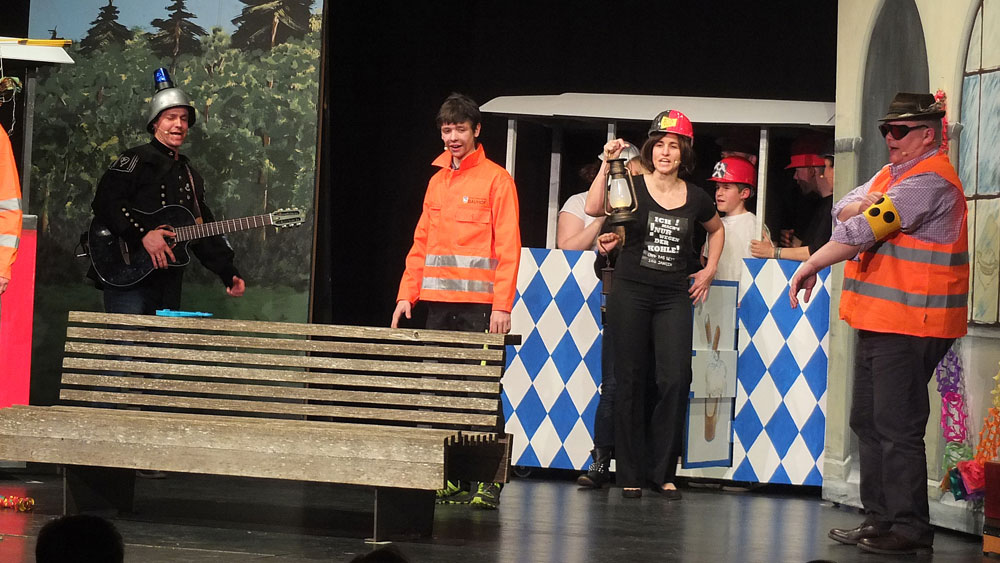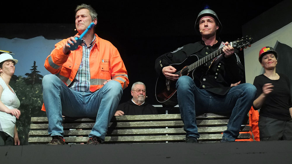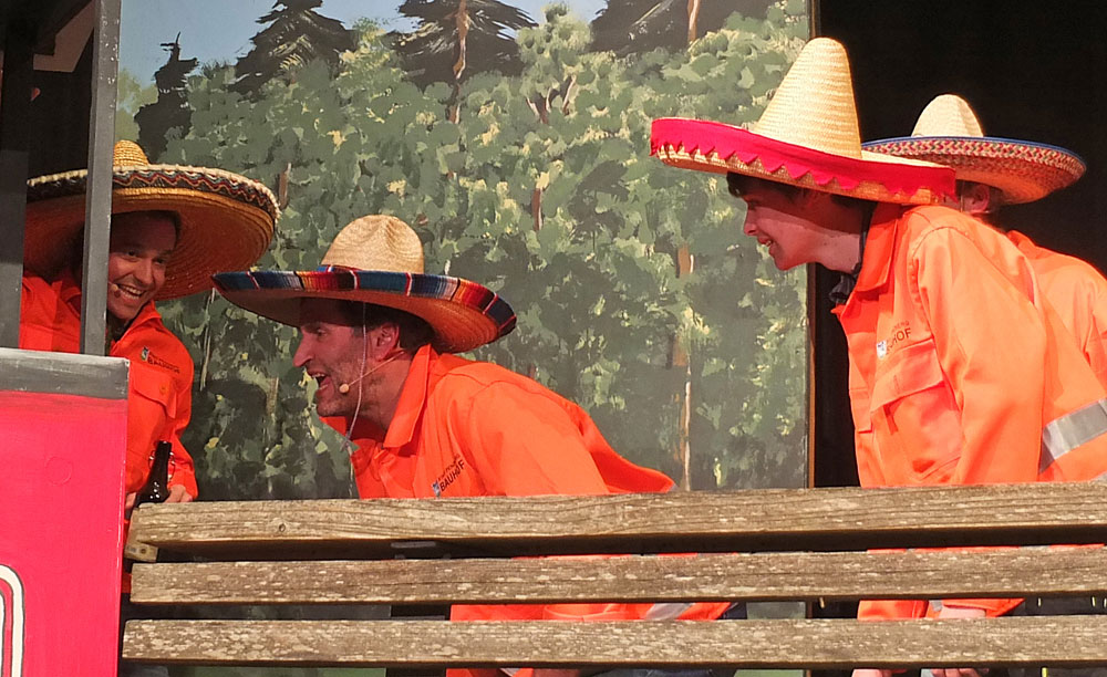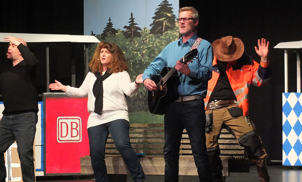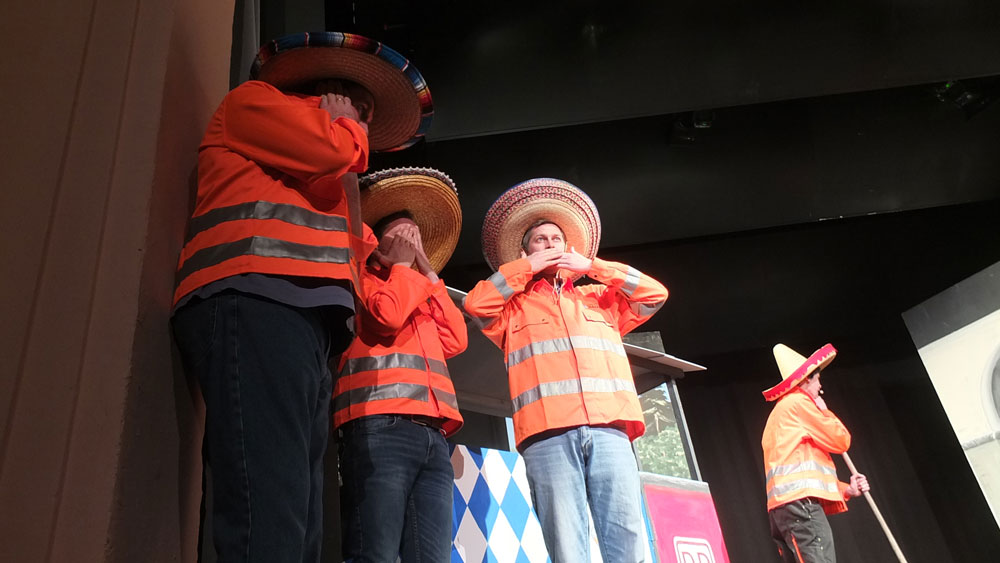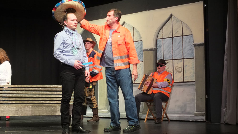 Als sich der Vorhang zum Singspiel öffnete, sah man einen Bauhofmitarbeiter mit Mexikaner-Hut. Das Lied vom Tod waberte unheilschwanger durch den Saal. Wem sollte diese Vision gelten? Dem Bauhof? Dem Bahnhof? Dem Stadtrat? Der Bürgermeisterin? Der ganzen Stadt? Während des Spiels war all dies denkbar, am Ende kam es doch ganz anders: